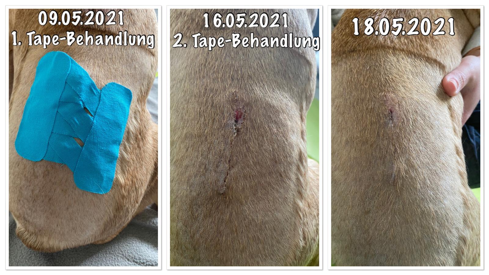 Kinesiologisches Taping ist eine tolle Behandlungsmethode, mit der viel gutes im Gewebe bewirkt werden kann. Aber diesen Tapeanlagen geht immer eine tierphysiotherapeutische Befundung und Behandlung voraus. Das Tape ist eine ergänzende Maßnahme, um die eigentliche Behandlung zusätzlich zu unterstützen, zu verstärken, zu verlängern und den Effekt der Behandlung somit länger anhaltend zu gestalten. Es kann zwar auch alleine für sich wirksam sein, aber es entfaltet seine beste und nachhaltigste Wirkung, wenn man das betroffene Gewebe vor dem Taping je nach Befund massiert, lockert, mobilisiert, aktiviert, dehnt und so weiter.